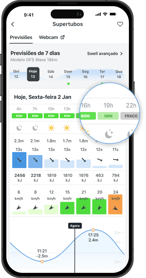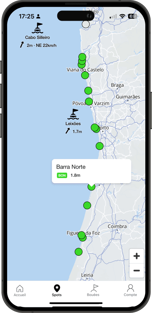 Acesse webcams em tempo real diretamente de cada spot, com imagens atualizadas que permitem ver as condições reais do mar antes de sair de casa.
