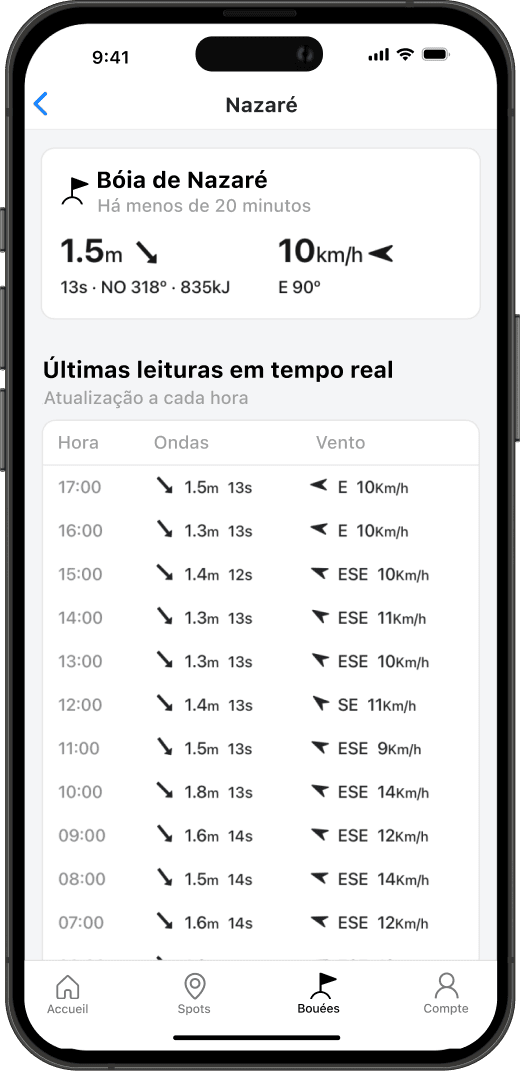 Lineup mostra diretamente em cada spot os dados da sua bóia mais próxima para compará-los com as previsões.