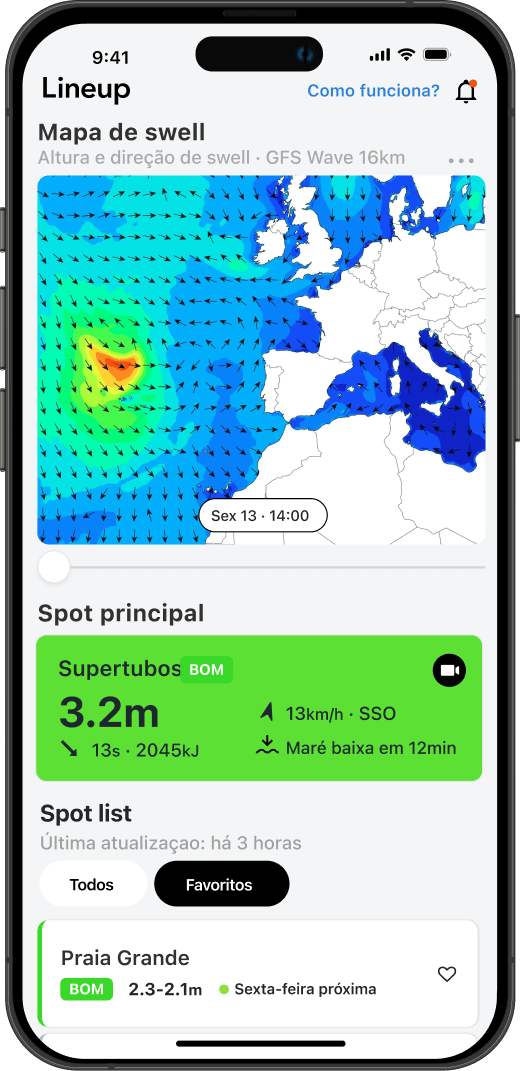 Lineup mostra diretamente em cada spot os dados da sua bóia mais próxima para compará-los com as previsões.